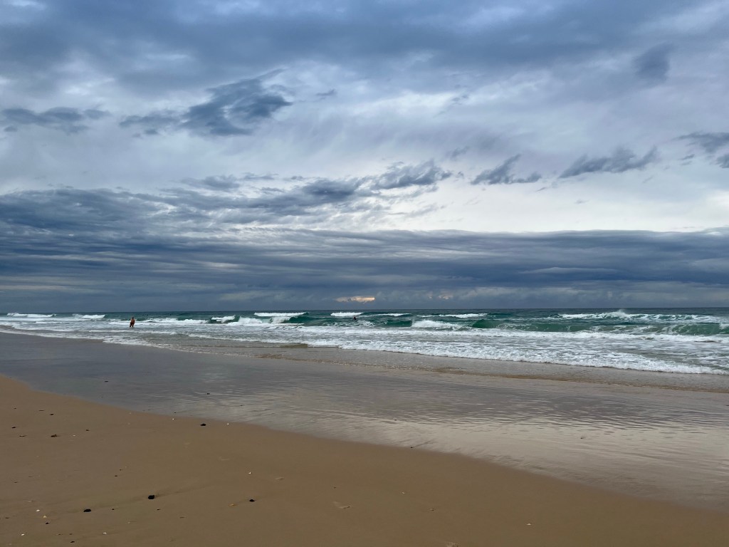 I’m sitting at the beach… it is overcast, drizzly, cold…the waves are wild and the sand is largely eroded. There are not a lot of people here this morning. The weather matches my mood perfectly or maybe my mood is matching the weather – either way it’s not a nice feeling.