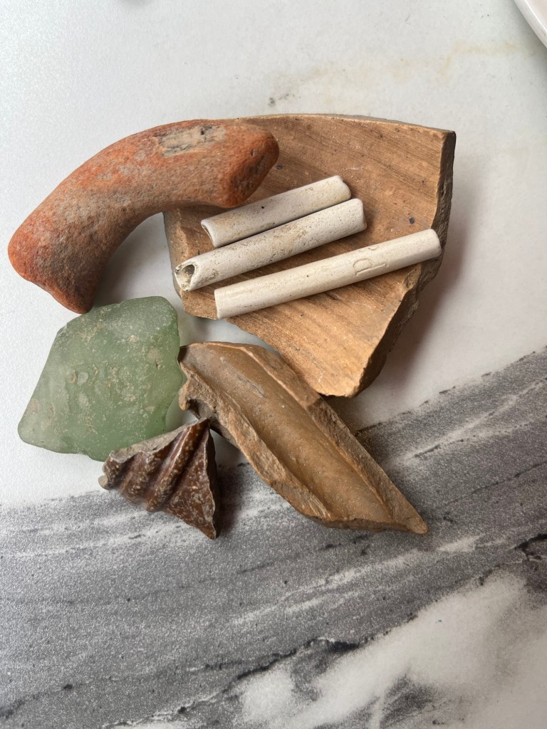 Mudlarking, is literally digging through the mud on the edge of the tideline to find forgotten treasures…. And there are all kinds of things to find! We saw a whole bunch of bones – and we are going with animal rather that people bones, and I collected some Roman pottery, bits of old glass and some Victorian pipe stems (it used to be fashionable to be seen smoking a pipe, and there was a whole array of disposable clay pipes that, once done with would be thrown away) … I didnt find an actual pipe, but am very happy with my treasures none the less!