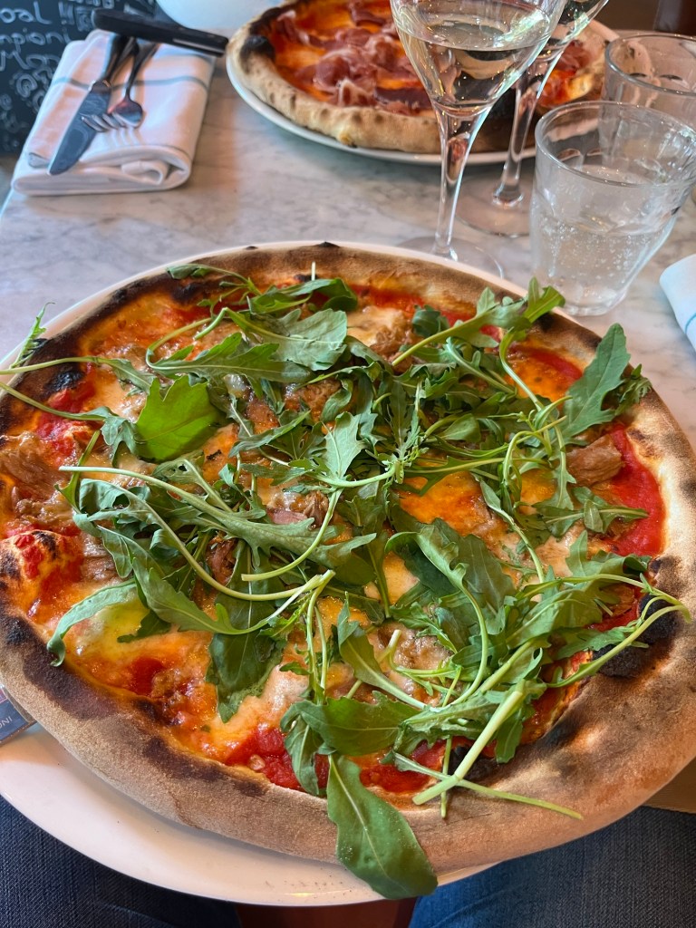 The weather was amazing – down right hot, so when lunch time came around, we were all happy to stop! We found a very nice Italian restaurant, right near the Eiffel Tower, and indulged our appetites. I had one of my very favourite things – Pizza el Tonno (tuna pizza) and it was delicious. We finished with a shared Tiramisu and a shot of Limoncello for D’s birthday which is next week.