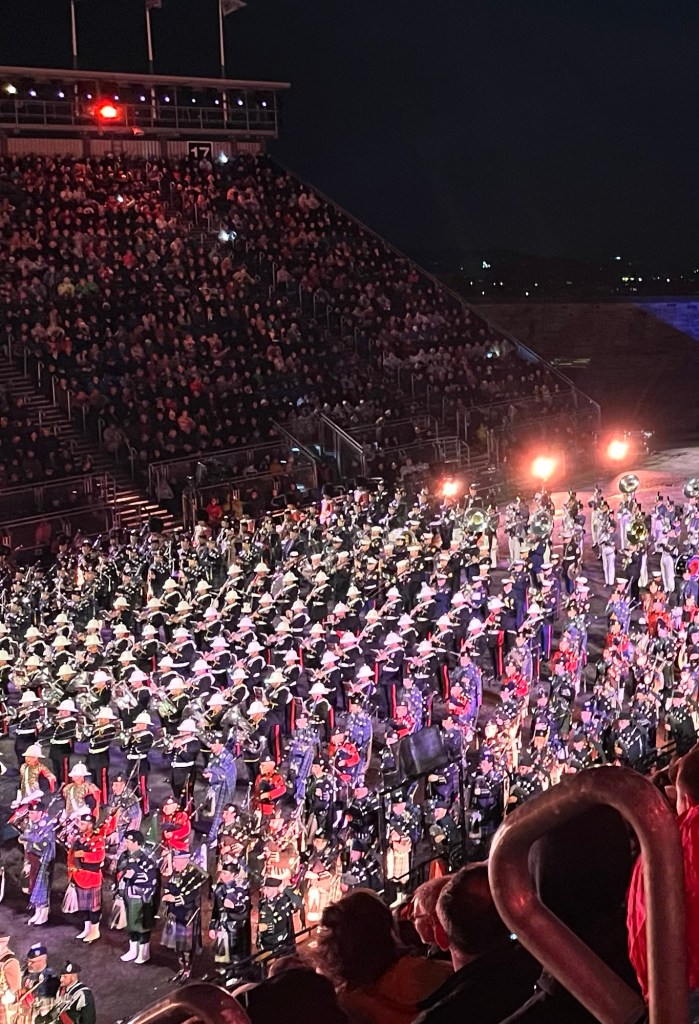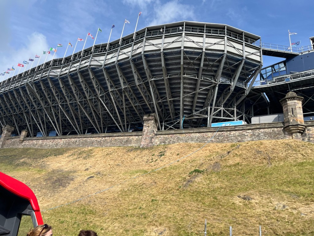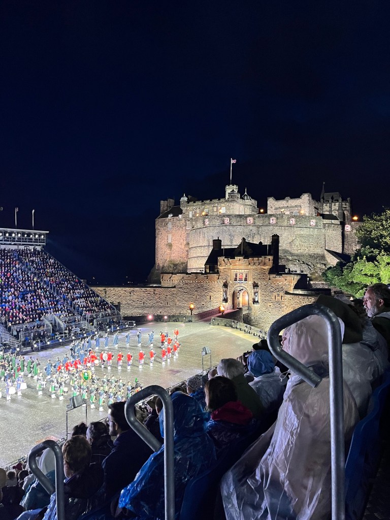 Back home and a bit of a lie down before we went off for one of the absolute highlights of the trip – the Edinburgh Military Tattoo! What a fabulous thing to be part of! The weather was not the most cooperative, but I think it just added to the atmosphere… we bundled into multiple layers topped with rain ponchos and made our way up the Royal mile and into the arena. The grand stands are built over the edge of the cliff and are terrifying if you’re not great with heights.