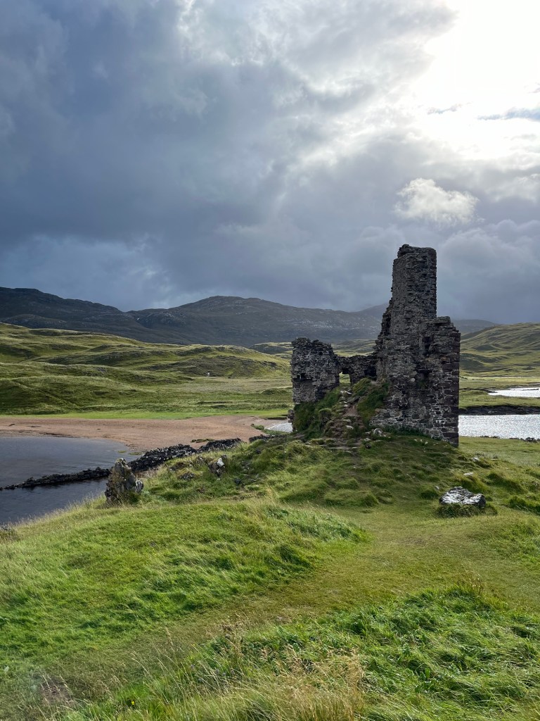 From Ullipool, we headed north. On the map, our drive was supposed to take three or so hours…. In reality it took 9, and we loved it! Our first detour/stop was at Ardvreck Castle… a ruin perched on a bit of a hill in a Loch. We caught sight of it as we crested a hill on the road. It kind of felt like the epitome of wild Scotland..