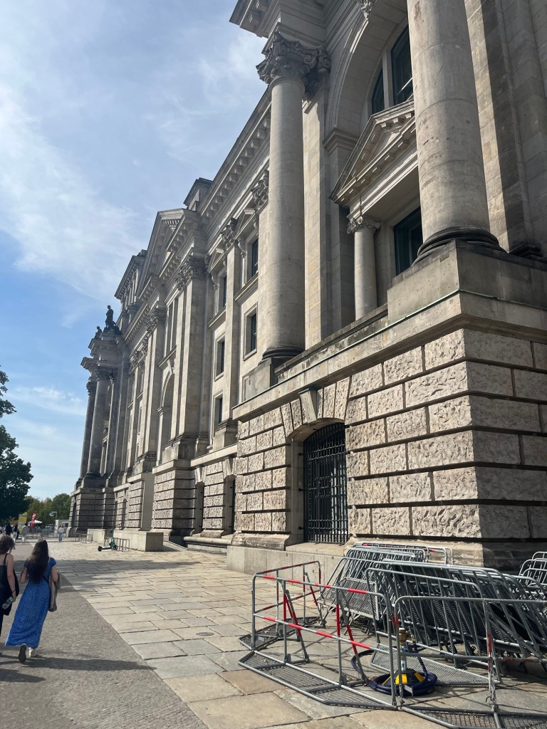 We passed the Brandenburg Gate again on our way to the Reichstag, home of the German Parliament. It is a huge and imposing building, that has a whole lot of bullet holes (remnants of the war) all over its facade. A lot of the buildings that survived the war time bombing seem to have shrapnel and bullet damage when you look more closely. (There is also quite a lot of construction/renovation work happening all over the place, so scaffolding seems to be part of most photos!)